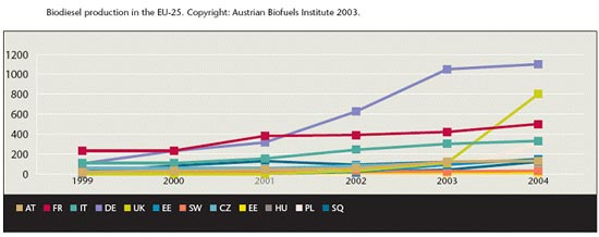Segundo a comunidade econômica européia (EBB) em 1998 foram produzidos 500 mil toneladas de biodiesel. Já em 2002 foram produzidos 1,06 milhões de toneladas de biodiesel, principalmente na Alemanha, França, Itália, Áustria, Dinamarca e Reino Unido. A produção mais que dobrou nos últimos quatro anos.